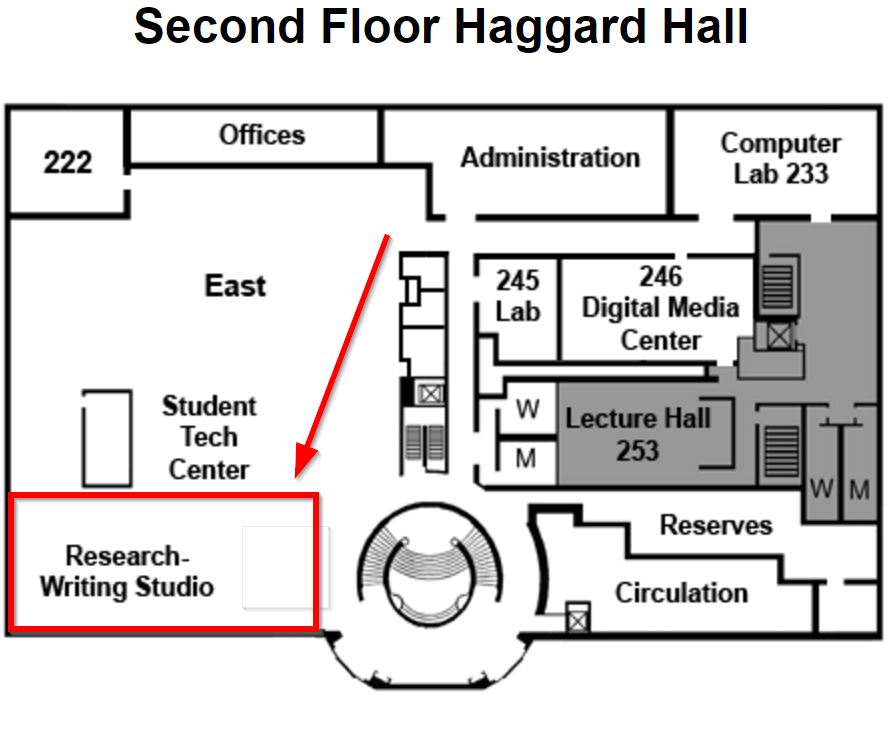 In person, you'll find the Research & Writing Studio on the second level of Haggard Hall, east side of the building (towards Red Square).
